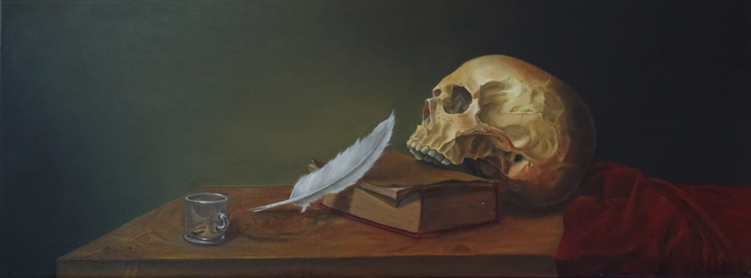 Sobre una mesa despejada, objetos cotidianos —un cuaderno, una pluma, un libro y una taza vacía— conviven con la presencia inesperada de un cráneo. Lejos de la moral del vanitas clásico, la escena no advierte sobre la muerte, sino que suspende el tiempo en el acto de escribir.